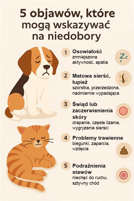 Przy problemach z sierścią i skórą – nadmierne linienie, matowość, świąd czy łupież to często objawy niedoborów.