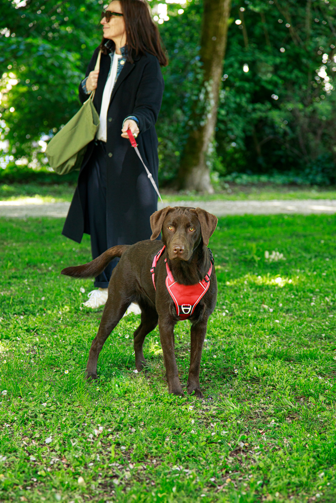 - Zintegrowana smycz wbudowana jest w mechanizm szelek. Gdy pies jest prowadzony na smyczy, opiekun korzysta z wygodnej rączki.