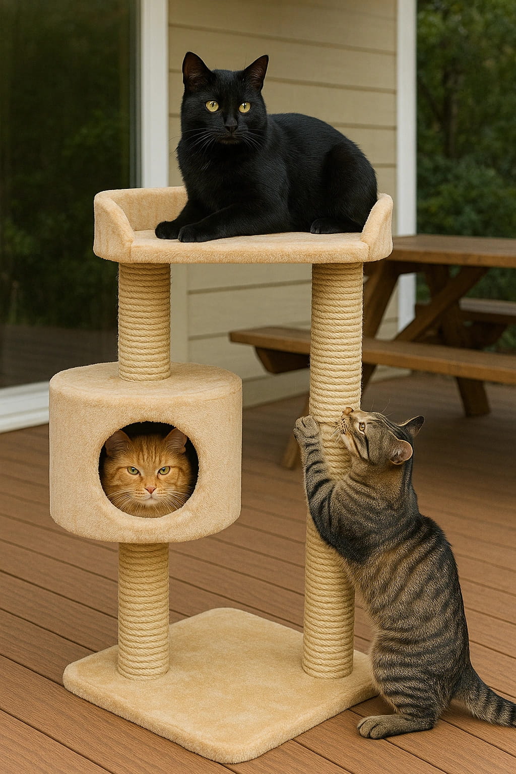 Drapak wyposażono w trzy słupki pokryte wytrzymałym plecionym sznurem z sizalu i juty. Te materiały są idealne do zaspokojenia naturalnego instynktu drapania, pozwalając kotu na pielęgnację pazurów i jednocześnie chroniąc Twoje meble przed uszkodzeniami.