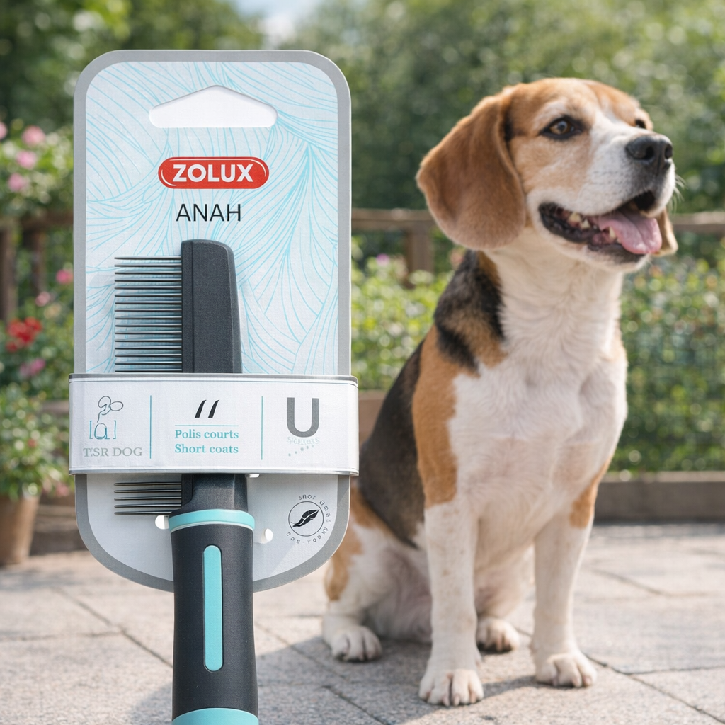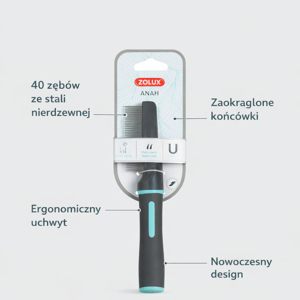 ZOLUX Grzebień ANAH 40 zębów to niezawodny wybór dla właścicieli psów z krótką sierścią. Dzięki wyjątkowym cechom, takim jak zaokrąglone końcówki zębów, ergonomiczny uchwyt i solidna konstrukcja, dba nie tylko o komfort pupila, ale i wygodę użytkownika. Doskonały design oraz troska o środowisko dodatkowo podkreślają jakość i nowoczesne podejście do pielęgnacji. ❤
