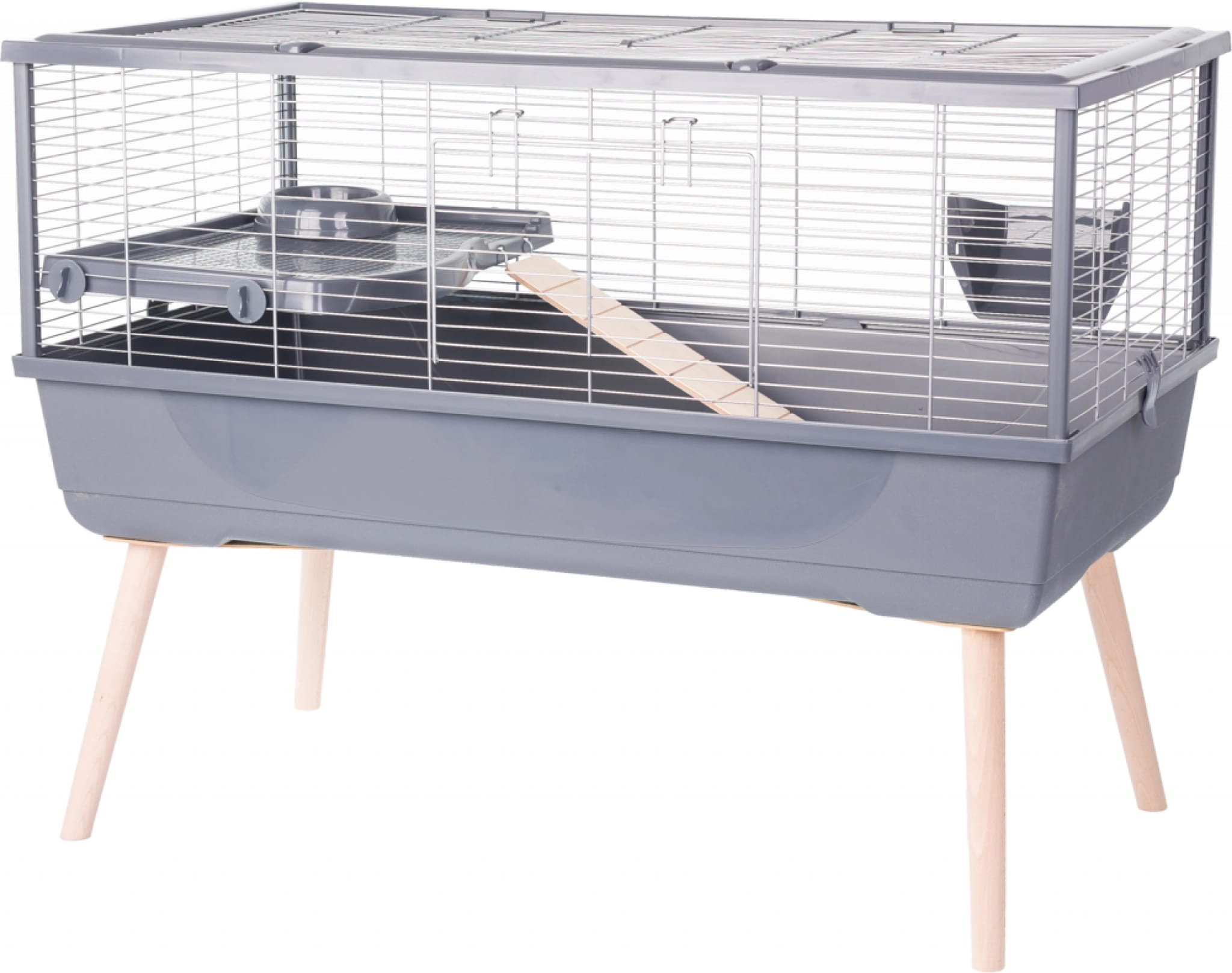 - Cztery drewniane nóżki stabilizują konstrukcję klatki, poprawiają jej estetykę i zwiększają cyrkulację powietrza pod kuwetą.