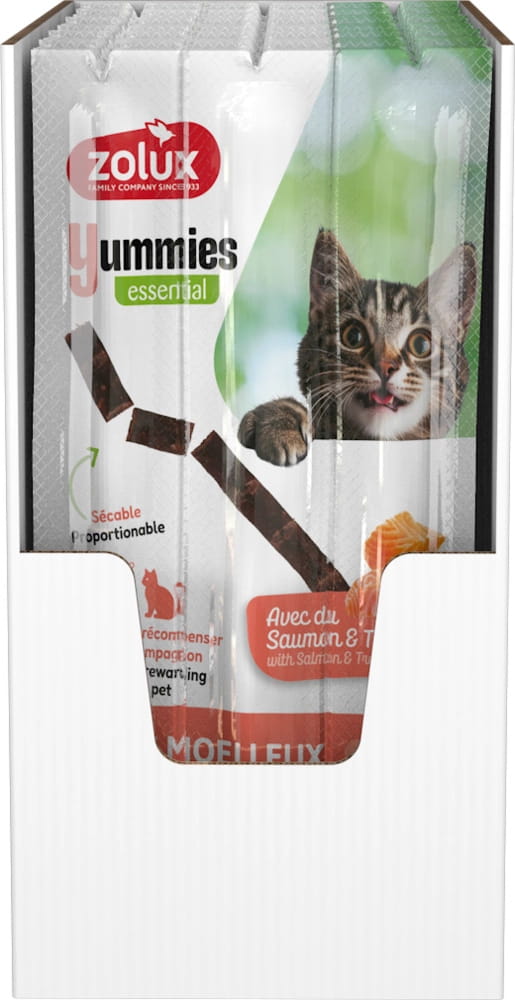 ZOLUX Miękkie Przysmaki Treningowe YUMMIES Pałeczki Łosoś Pstrąg to pyszna i zdrowa przekąska dla każdego kota. Wyprodukowane w Unii Europejskiej, przysmaki te zapewniają najwyższą jakość i bezpieczeństwo. Opracowane w oparciu o łososia i pstrąga, posiadają wysoką zawartość mięsa rybnego, co nadaje im wyjątkowy smak oraz intensywny aromat, któremu nie oprze się żaden kot.