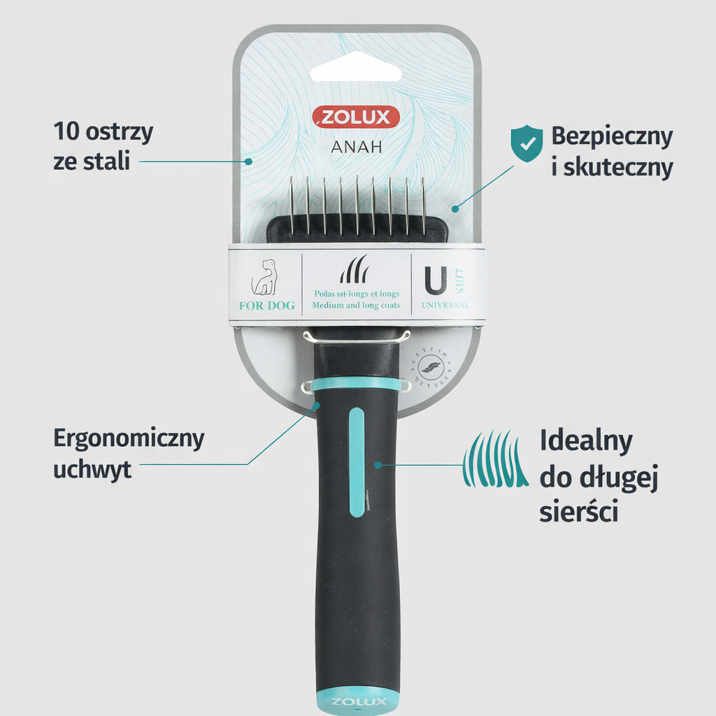 ZOLUX Rozcinak dla Psa z 10 Ostrzami ANAH to wysokiej jakości narzędzie, które umożliwia usuwanie drobnych kołtunów, wygładzanie sierści i pielęgnację podszerstka. Dzięki wytrzymałości i innowacyjnej konstrukcji zapewnia skuteczność i bezpieczeństwo podczas codziennej pielęgnacji Twojego pupila.